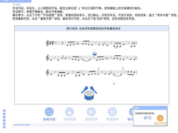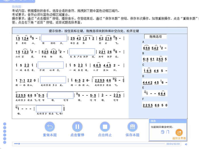 ★ 試聽音樂,將右側(cè)選項區(qū)內(nèi)合適的音符拖拽到樂譜空白處,以考查考生的識譜能力。