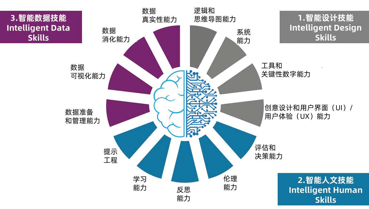 人類與人工智能之間強(qiáng)大的協(xié)同是世界快速發(fā)展的關(guān)鍵,而高校在塑造人工智能融合的未來方面發(fā)揮著舉足輕重的作用。這就要求進(jìn)行靈活、創(chuàng)新和高瞻遠(yuǎn)矚的教育改革,超越傳統(tǒng),培養(yǎng)能夠熟練運(yùn)用人工智能推動(dòng)社會(huì)進(jìn)步的積極主動(dòng)的領(lǐng)導(dǎo)者。這項(xiàng)改革的關(guān)鍵是培養(yǎng)三種能力——智能人文技能、智能數(shù)據(jù)技能和智能設(shè)計(jì)技能,并將其完美地融入課程和實(shí)踐中。這些能力對于培養(yǎng)學(xué)生的倫理素養(yǎng)、批判性思維和解決問題的能力至關(guān)重要,使學(xué)生有能力成為敏捷的創(chuàng)造者。