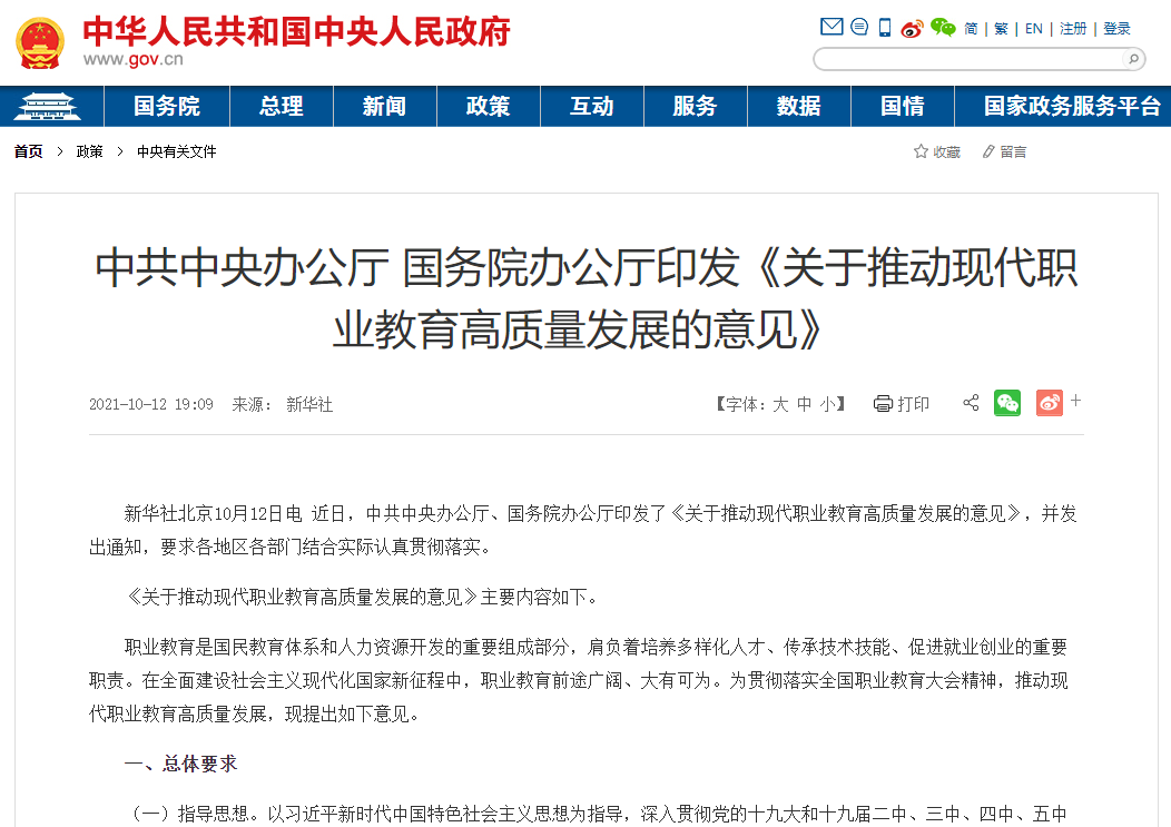 《關(guān)于推動(dòng)現(xiàn)代職業(yè)教育高質(zhì)量發(fā)展的意見(jiàn)》主要內(nèi)容如下。