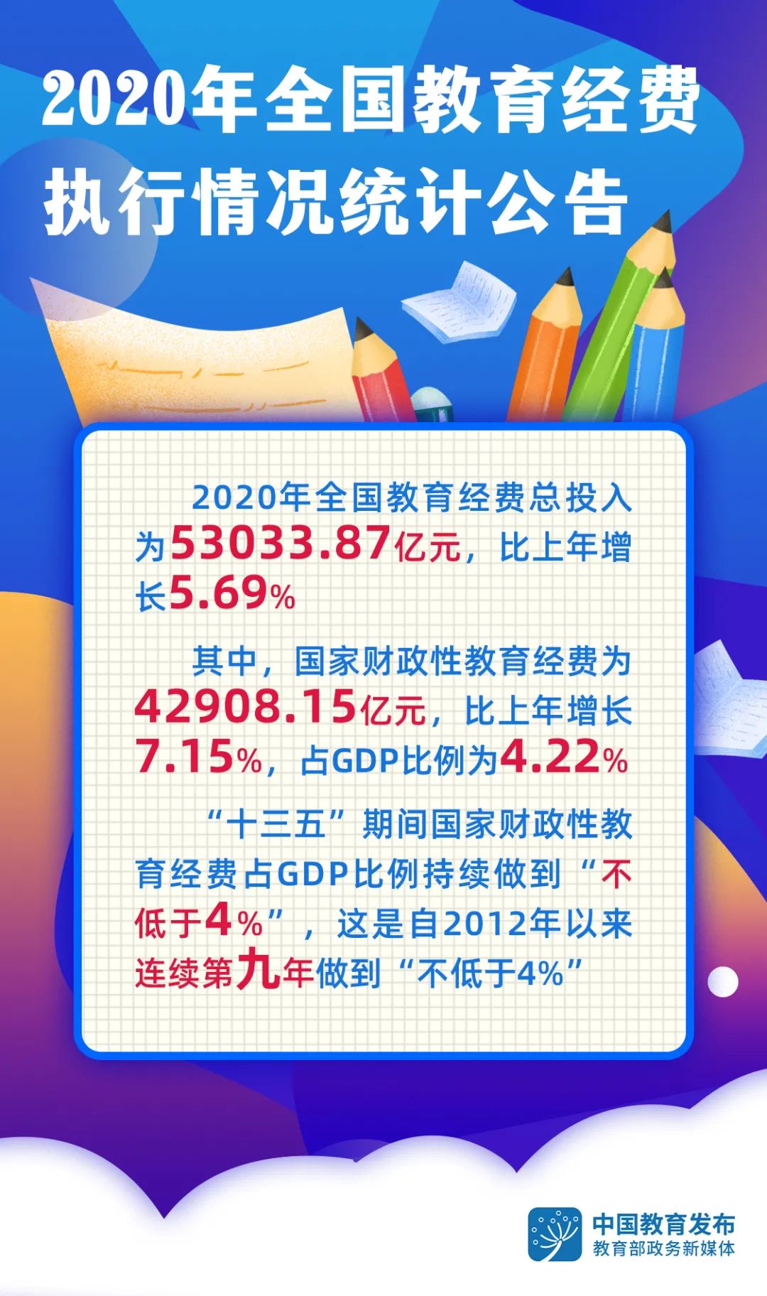 教育部、國家統(tǒng)計局、財政部近日發(fā)布了《關(guān)于2020年全國教育經(jīng)費(fèi)執(zhí)行情況統(tǒng)計公告》(以下簡稱“《公告》”)。《公告》顯示,2020年全國教育經(jīng)費(fèi)總投入為53033.87億元,比上年的50178.12億元增長5.69%。