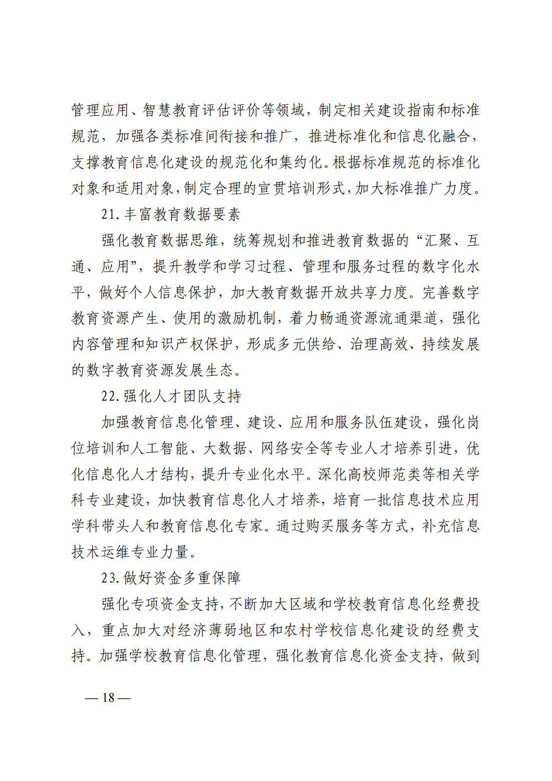 (七)做好要素集聚應(yīng)用:1、建立健全標(biāo)準(zhǔn)體系;2、豐富教育數(shù)據(jù)要素;3、強化人才團隊支持;4、做好資金多重保障;5、加快技術(shù)應(yīng)用研究