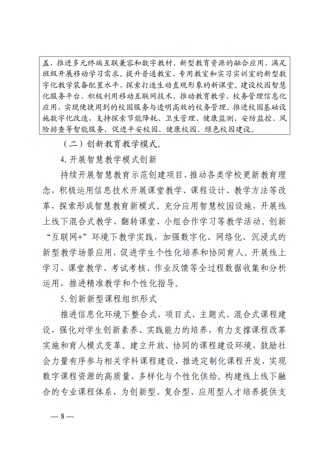 (二)創(chuàng)新教育教學(xué)模式:1、開展智慧教學(xué)模式創(chuàng)新;2、創(chuàng)新新型課程組織形式;3、加快教育評價手段創(chuàng)新
