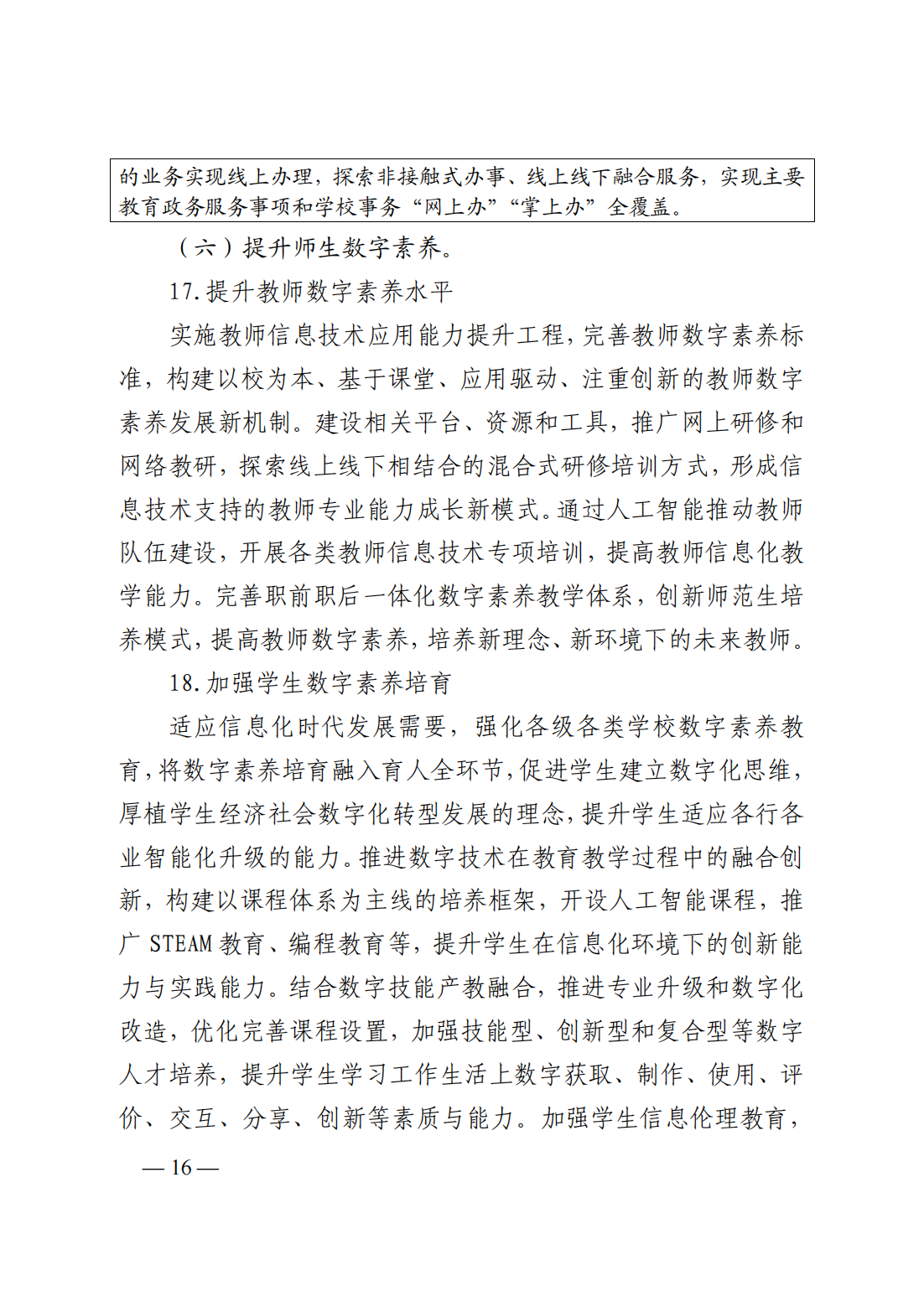 (六)提升師生數(shù)字素養(yǎng):1、提升教師數(shù)字素養(yǎng)水平;2、加強學(xué)生數(shù)字素養(yǎng)培育;3、開展數(shù)字素養(yǎng)水平監(jiān)測