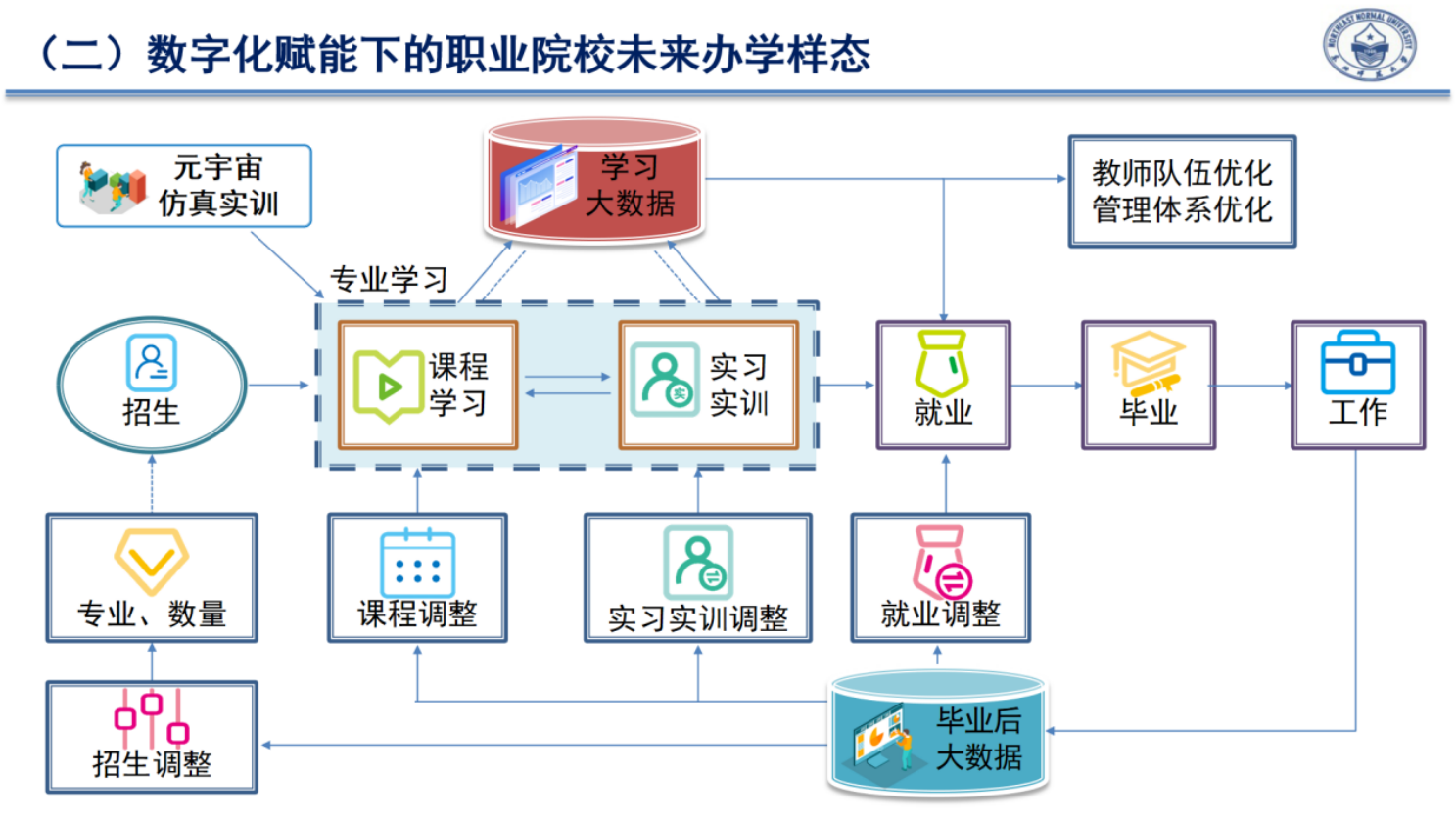 未來職業(yè)教學樣態(tài)一定是從學生的招生、課程學習、實習實訓、就業(yè)、畢業(yè)、工作的全過程閉環(huán)。其中包括數(shù)據(jù)賦能,VR、AR賦能、人工智能手段工具賦能等等,從而形成一體化聯(lián)動體系。