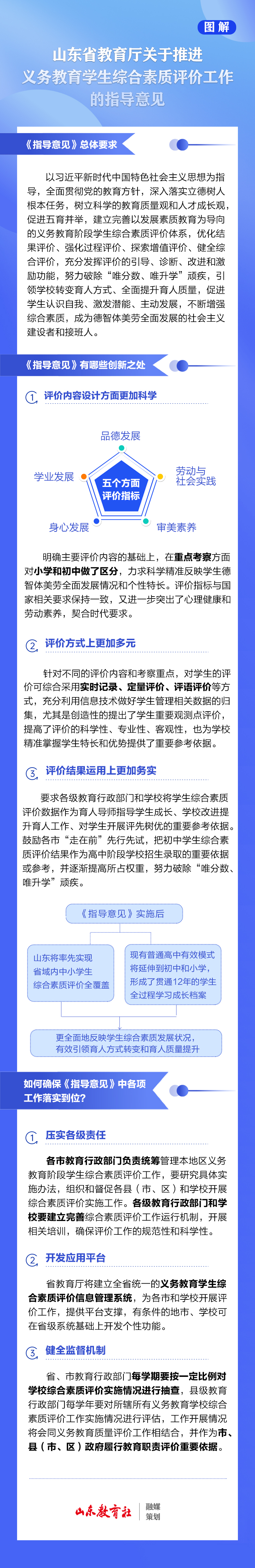 答:一是壓實(shí)各級(jí)責(zé)任。各市教育行政部門負(fù)責(zé)統(tǒng)籌管理本地區(qū)義務(wù)教育階段學(xué)生綜合素質(zhì)評(píng)價(jià)工作,要研究具體實(shí)施辦法,組織和督促各縣(市、區(qū))和學(xué)校開展綜合素質(zhì)評(píng)價(jià)實(shí)施工作。各級(jí)教育行政部門和學(xué)校要建立完善綜合素質(zhì)評(píng)價(jià)工作運(yùn)行機(jī)制,開展相關(guān)培訓(xùn),確保評(píng)價(jià)工作的規(guī)范性和科學(xué)性。二是開發(fā)應(yīng)用平臺(tái)。省教育廳將建立全省統(tǒng)一的義務(wù)教育學(xué)生綜合素質(zhì)評(píng)價(jià)信息管理系統(tǒng),為各市和學(xué)校開展評(píng)價(jià)工作,提供平臺(tái)支撐,有條件的地市、學(xué)校可在省級(jí)系統(tǒng)基礎(chǔ)上開發(fā)個(gè)性功能。三是健全監(jiān)督機(jī)制。省、市教育行政部門每學(xué)期要按一定比例對(duì)學(xué)校綜合素質(zhì)評(píng)價(jià)實(shí)施情況進(jìn)行抽查,縣級(jí)教育行政部門每學(xué)年要對(duì)所轄所有義務(wù)教育學(xué)校綜合素質(zhì)評(píng)價(jià)工作實(shí)施情況進(jìn)行評(píng)估,工作開展情況將會(huì)同義務(wù)教育質(zhì)量評(píng)價(jià)工作相結(jié)合,并作為市、縣(市、區(qū))政府履行教育職責(zé)評(píng)價(jià)重要依據(jù)。