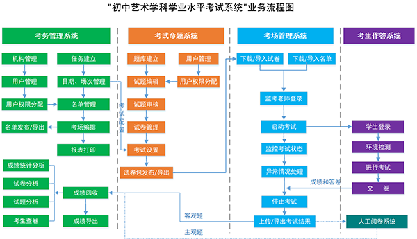 其次,初中藝術(shù)科目考試系統(tǒng)中考務(wù)管理系統(tǒng)的建立,可實(shí)現(xiàn)考試數(shù)據(jù)的存儲(chǔ)、自動(dòng)下載、網(wǎng)絡(luò)化巡考、監(jiān)控和考試結(jié)果自動(dòng)上報(bào)等功能,助力教育主管單位實(shí)現(xiàn)“以考促教,以考促學(xué),以考促建”目標(biāo)。