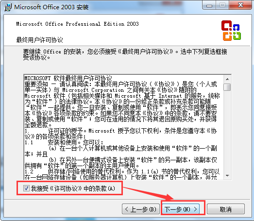 ⑦在彈出的界面上勾選“我接受……”,然后單擊“下一步”